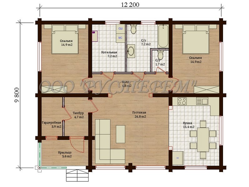 Данный проект можно выполнить из бревна ручной рубки, оцилиндрованного бревна (естественной влажности и камерной сушки), профилированного бруса (естественной влажности и камерной сушки) и клееного бруса.